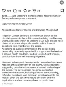 The development comes after allegations surfaced that Blessing Okoro, popularly known as Blessing CEO, may have misrepresented a cancer diagnosis.