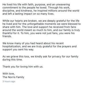 According to the family, Norris passed away on Thursday morning. However, details surrounding his death remain limited. In a heartfelt message posted on Instagram, his family described the loss as deeply painful. They highlighted his role not only as a public figure but as a family man.